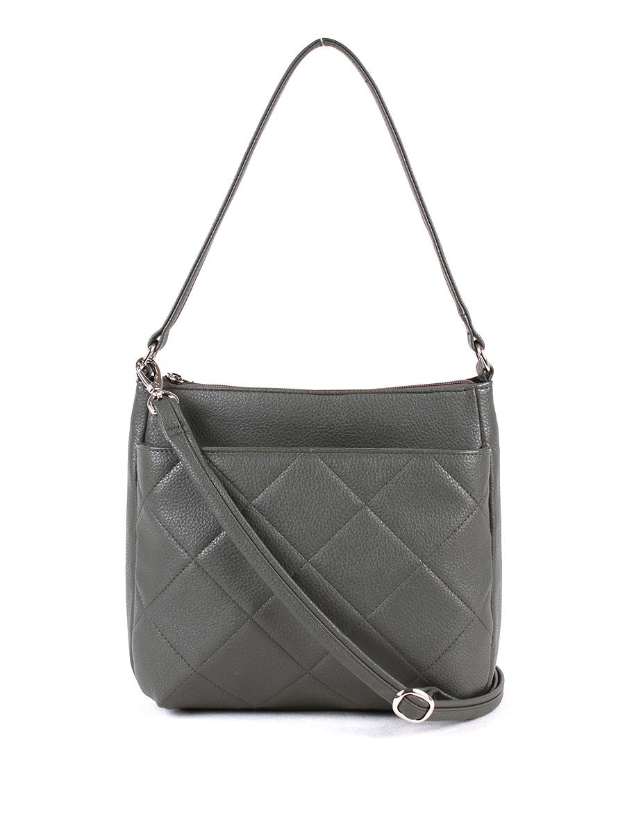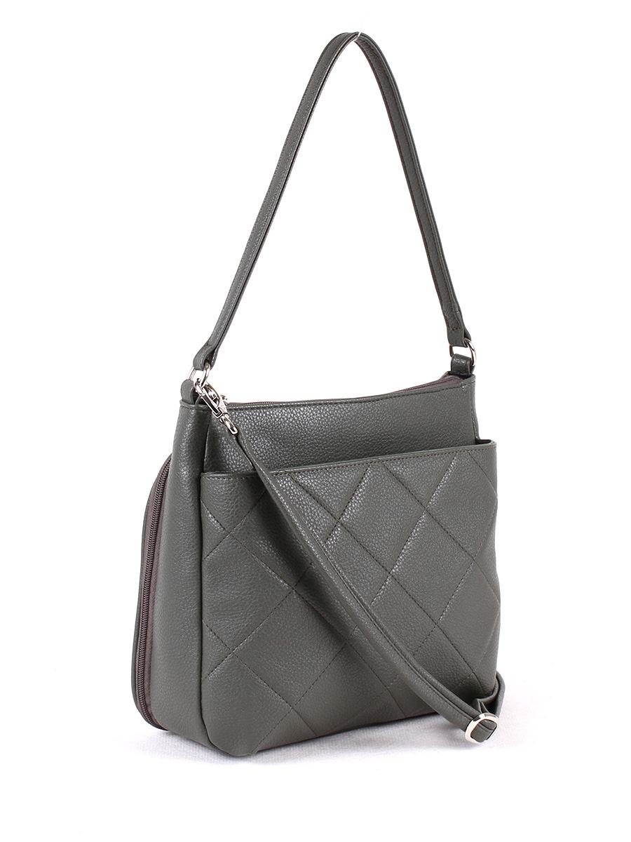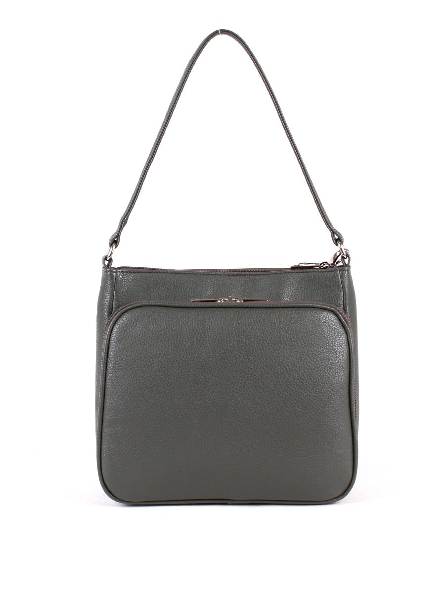 Аккуратная женская сумочка с одним отделением на молнии. На передней стенке глубокий карман на молнии, украшеный стёжкой. На задней - большой округлый карман на молнии. Внутри - карман на молнии и два открытых кармана для мелочей. Высота ручки 23 см., что позволяет носить сумку как в руках, так и на плече. Максимальная длина съемного регулируемого ремня -  145 см