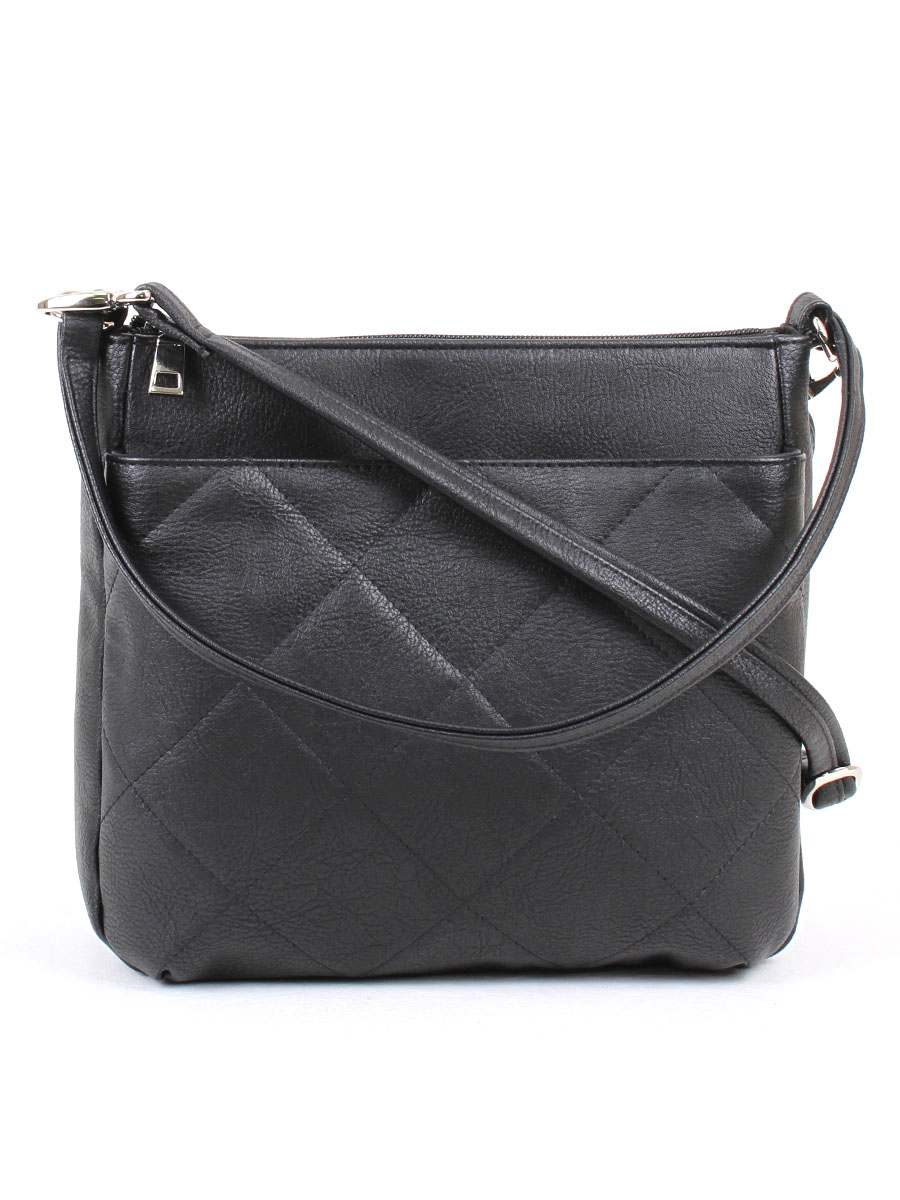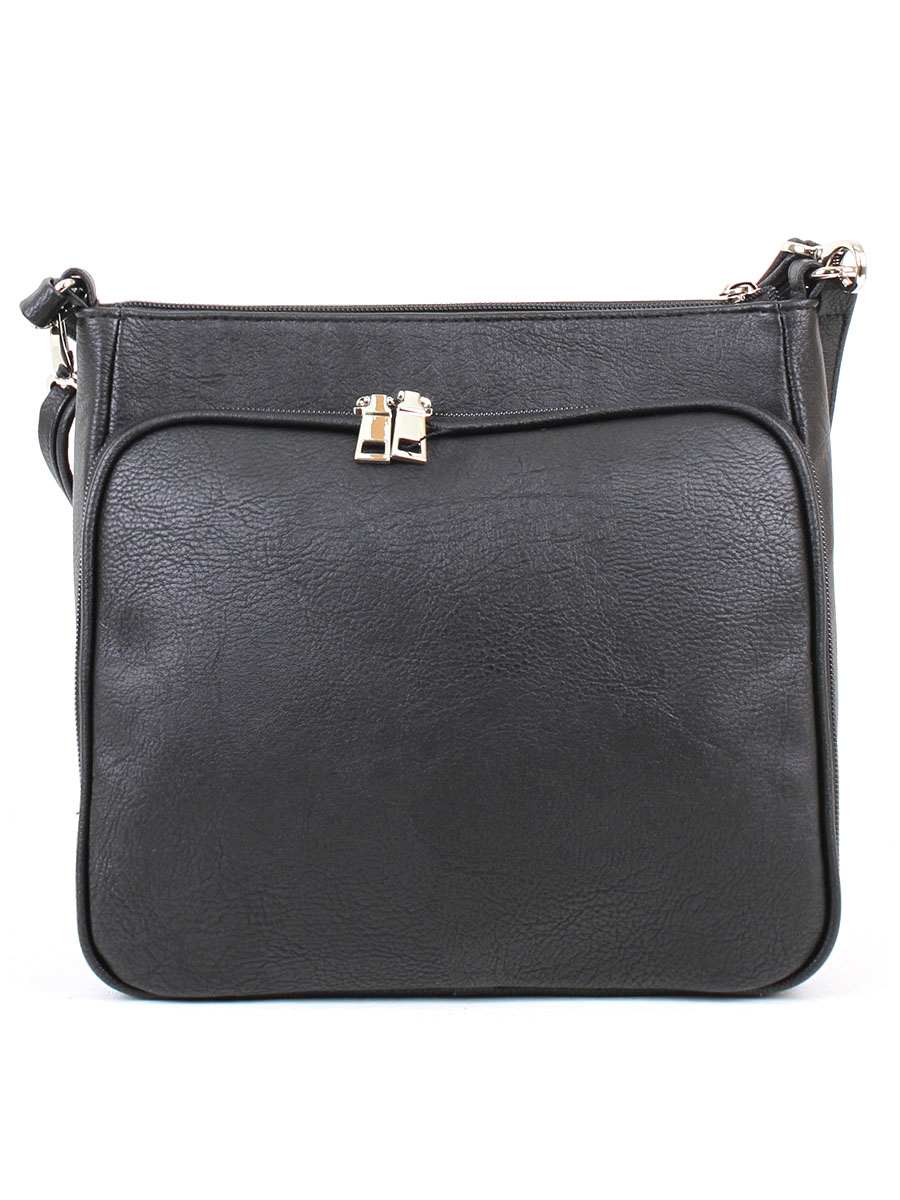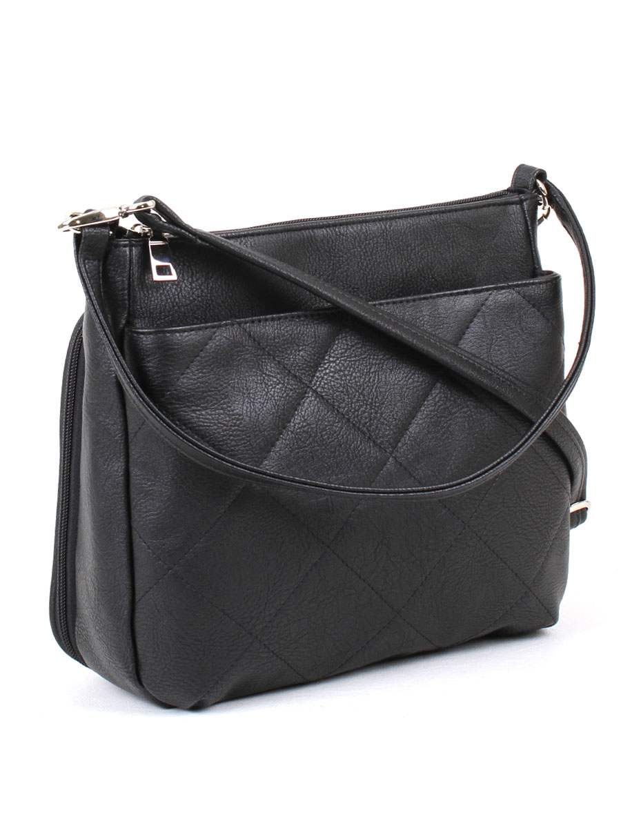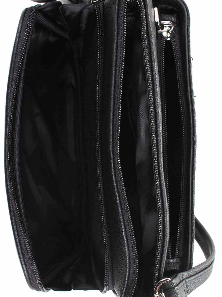 Аккуратная женская сумочка с одним отделением на молнии. На передней стенке глубокий карман на молнии, украшеный стёжкой. На задней - большой округлый карман на молнии. Внутри - карман на молнии и два открытых кармана для мелочей. Высота ручки 23 см., что позволяет носить сумку как в руках, так и на плече. Максимальная длина съемного регулируемого ремня -  145 см