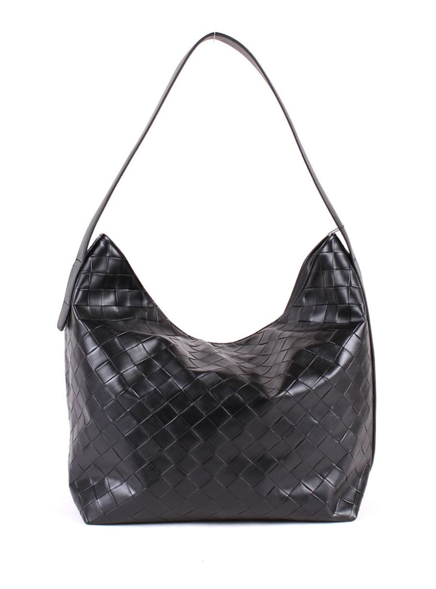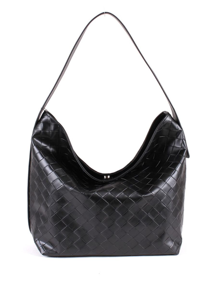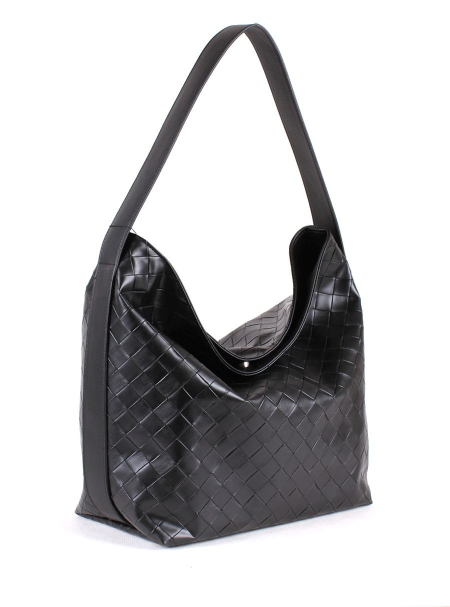 Женская сумка-мешок с одним отделением, закрывается на кнопку. Внутри два открытых кармана и карман на молнии.