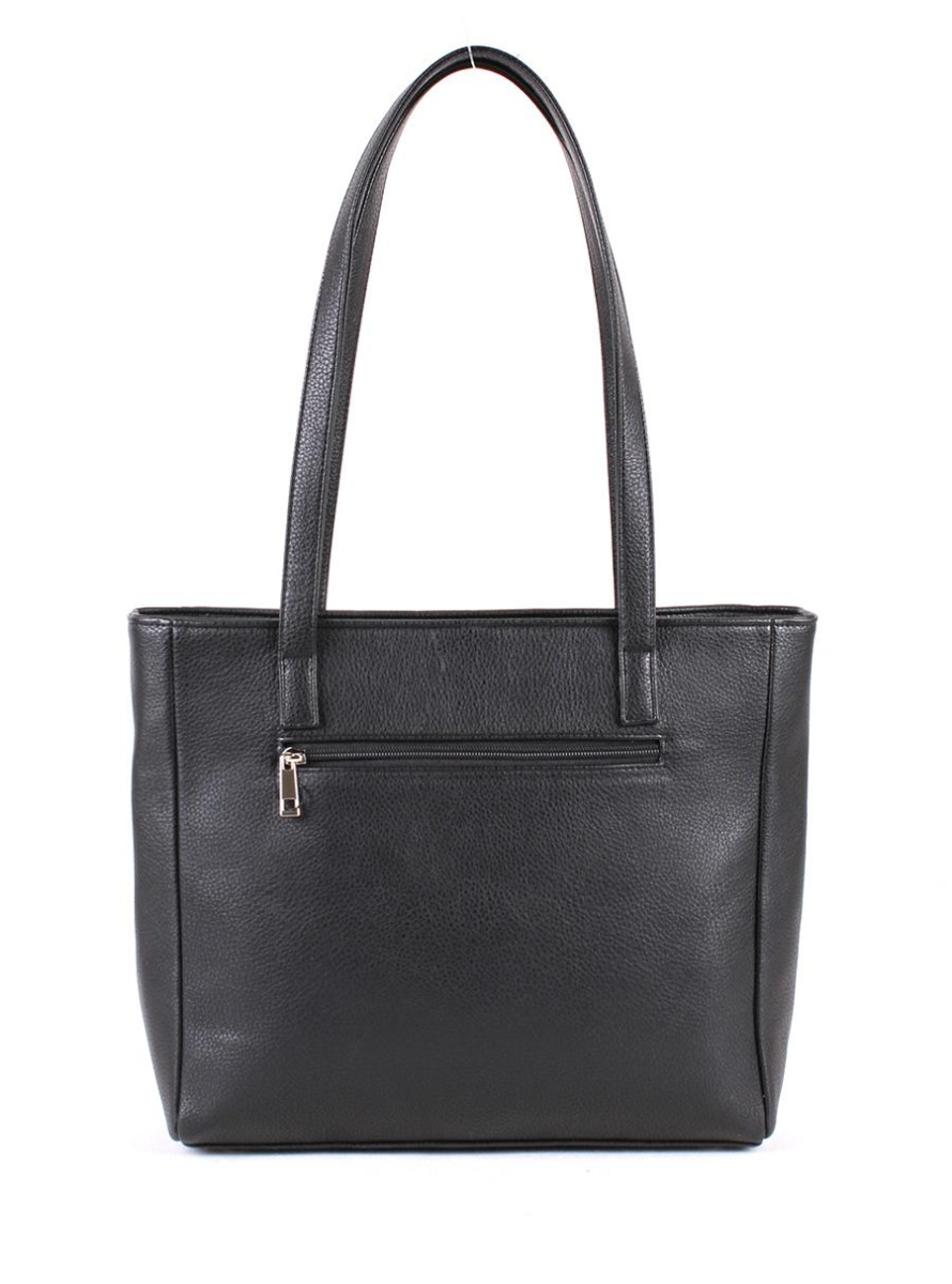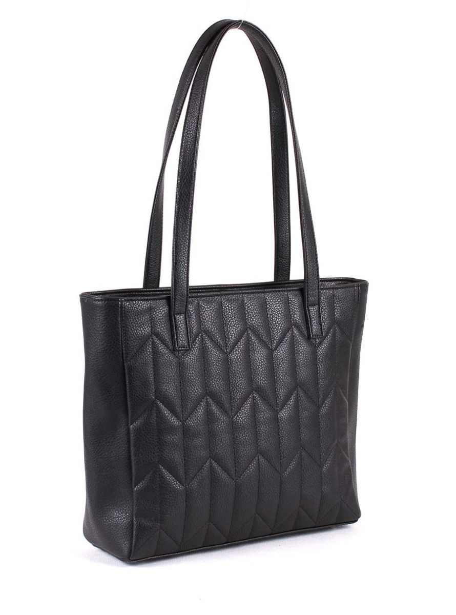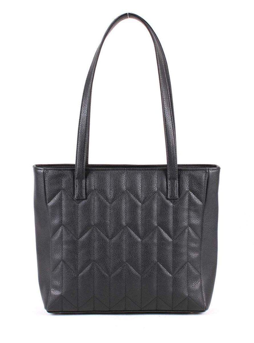 Сумка женская с одним отделением на молнии. Вмещает формат А4. Передняя стенка украшена стёжкой. На задней стенке - карман на молнии. Внутри - два открытых кармана и карман на молнии. На дне - металлические ножки-пукли. Две ручки высотой 30 см.