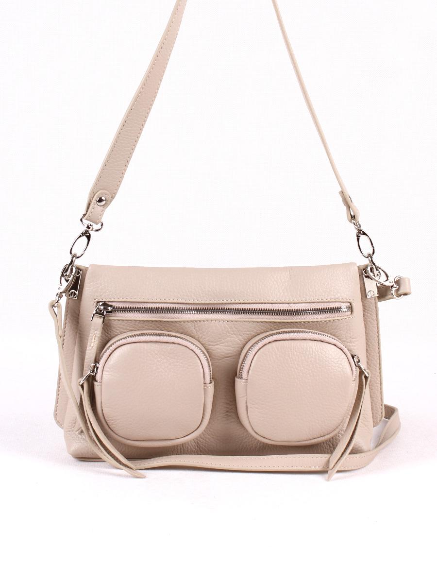 Кожаная женская сумка, кросс-боди, с одним отделением на молнии. На передней стенке - два накладных округлых кармана на молнии. На задней стенке - карман на молнии.Внутри - карман на молнии и карман для сотового телефона. Высота съемной ручки 30 см. Съемный регулируемый ремень.