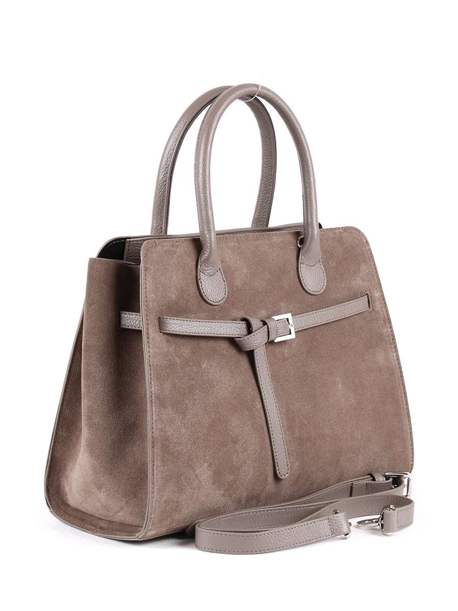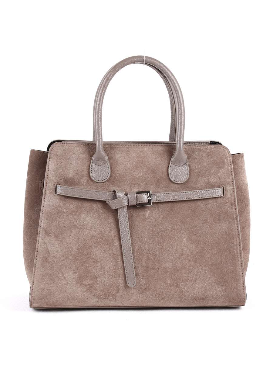 Сумка женская из натуральной замши с отделкой из натуральной кожи. Закрывается на молнию. Передняя стенка декорирована изящным ремешком. Внутри - открытый карман. Две ручки высотой 13 см. Съемный регулируемый ремень.
