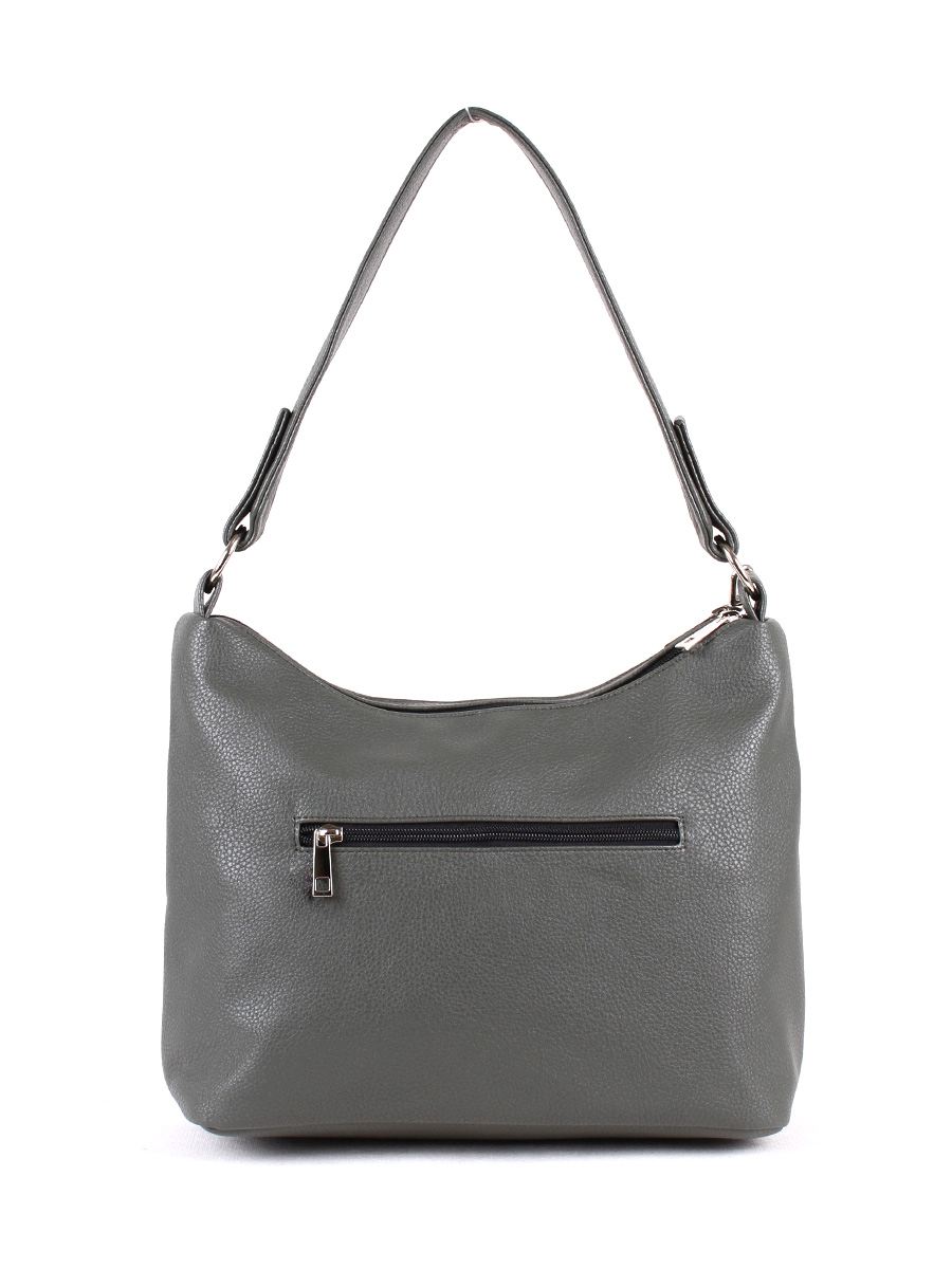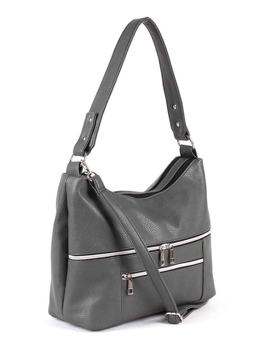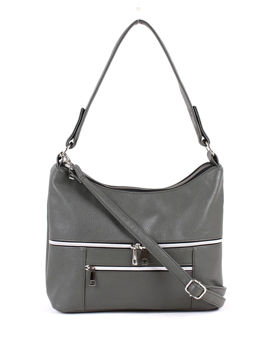 Сумка женская с двумя отделениями на молнии. На перердней стенке - два, на задней - один карман на молнии. Внутри первого отделения - два открытых кармана для мелочей, внутри второго - карман на молнии. Одна ручка высотой 30 см. Съёмный регулируемый ремень.
