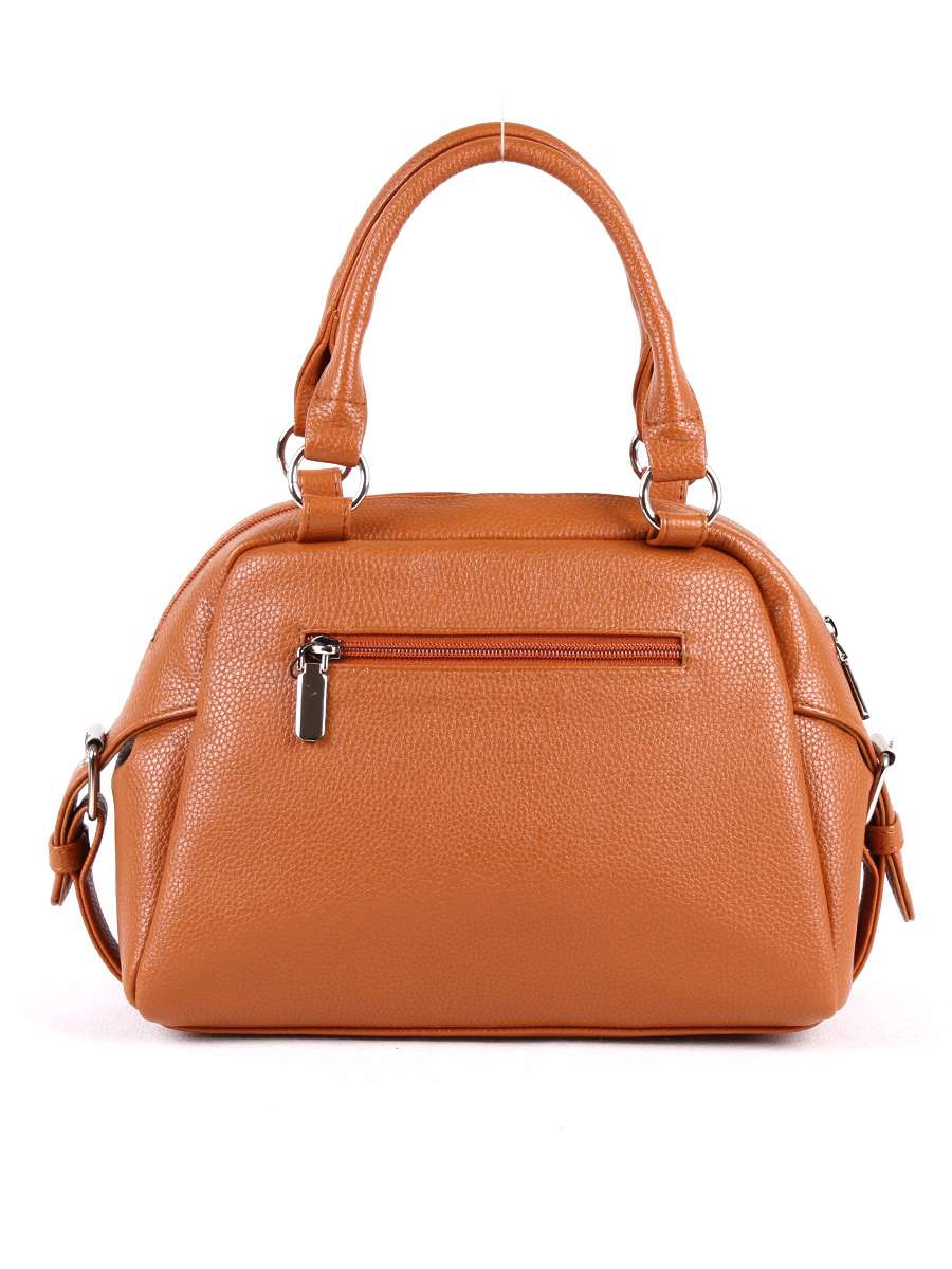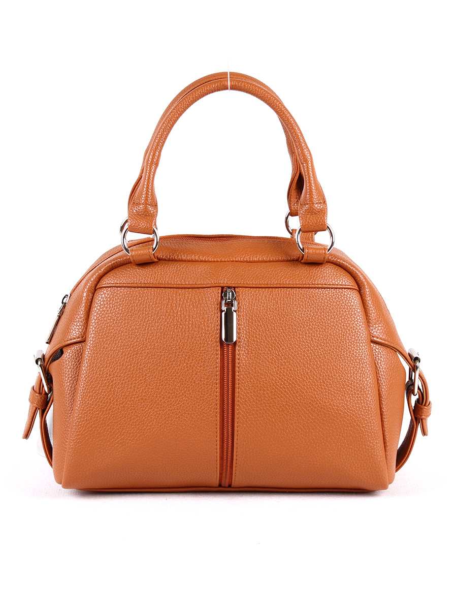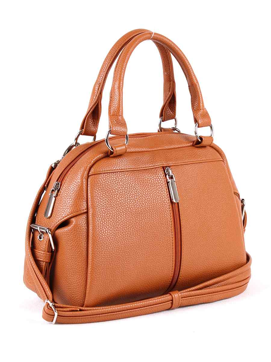 Сумка женская с одним отделением на молнии. По бокам украшена декоративными пряжками.На передней стенке - вертикальный, на задней - горизонтальный карманы на молнии.  Внутри - открытый карман для мобильного телефона, карман на молнии для документов. Две ручки высотой 15 см. Съемный регулируемый ремень.