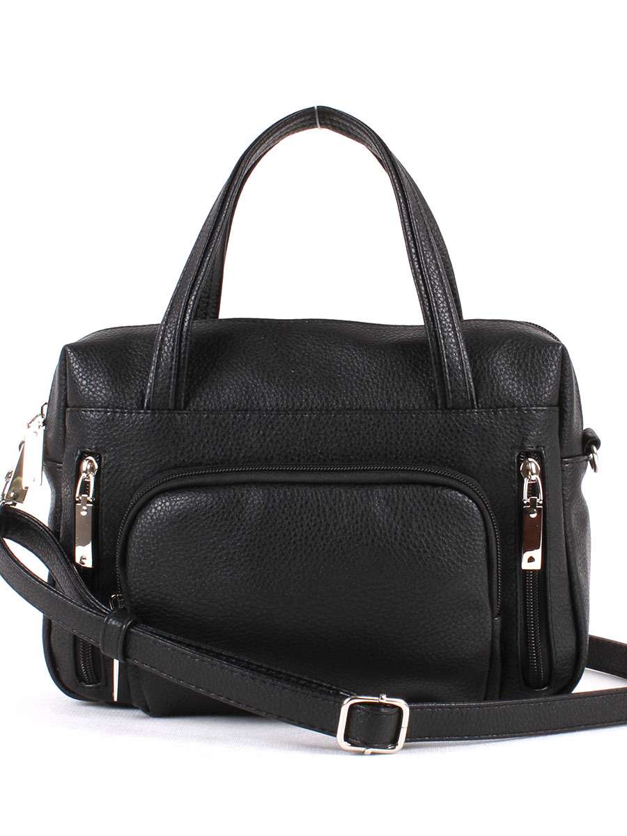 Сумка женская с одним отделением на молнии. На передней стенке -два вертикальных и один накладной карман на молнии. На задней стенке - карман на молнии. Внутри - карман на молнии для документов, открытый карман для мобильного телефона. Высота ручек - 15 см. Съёмный регулируемый ремень. Размеры 280х180х100