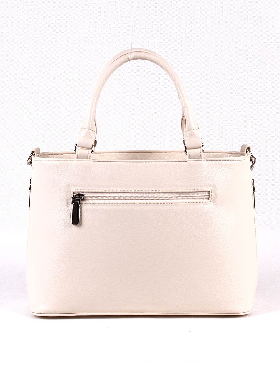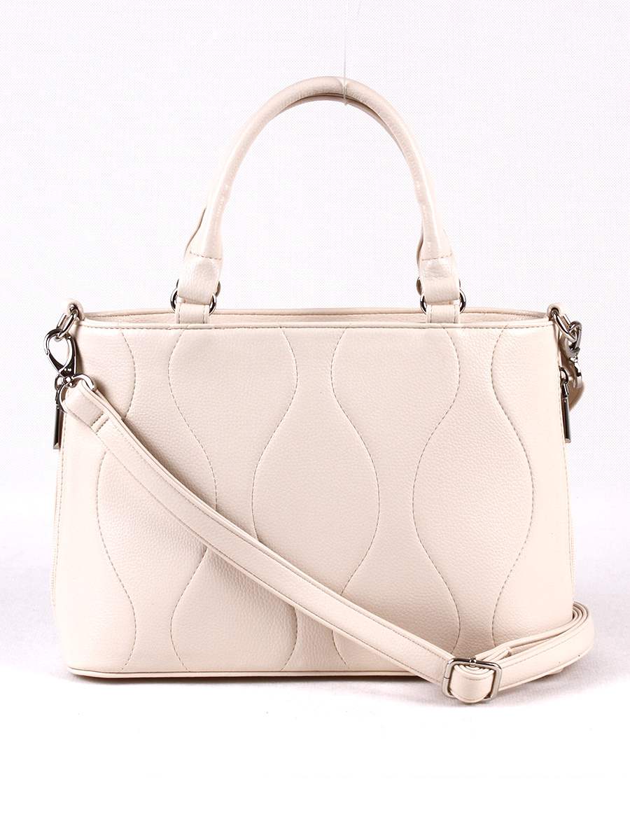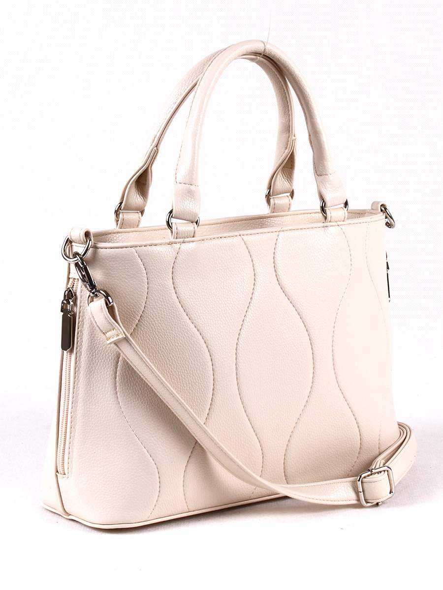 Сумка женская с одним отделением на молнии. Передня стенка украшена декоративной стёжкой. На задней стенке, внутри и снаружи - карманы на молнии. Внутри сумки - два открытых кармашка для мелочей и карман на молнии для документов. Две ручки высотой 13 см. Сёмный регулируемый ремень.