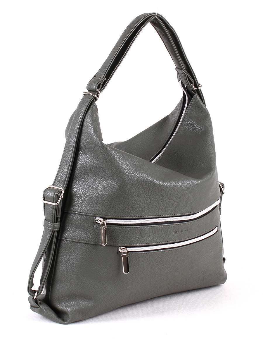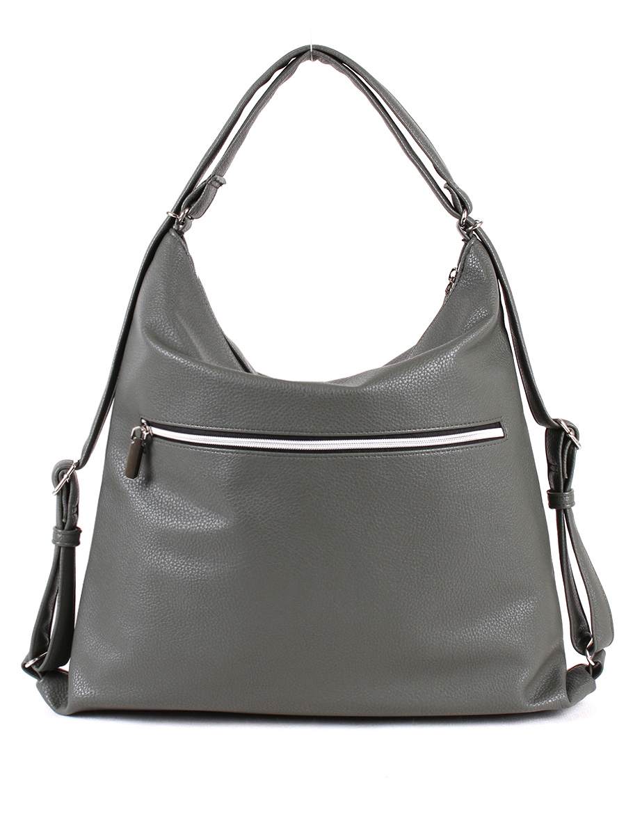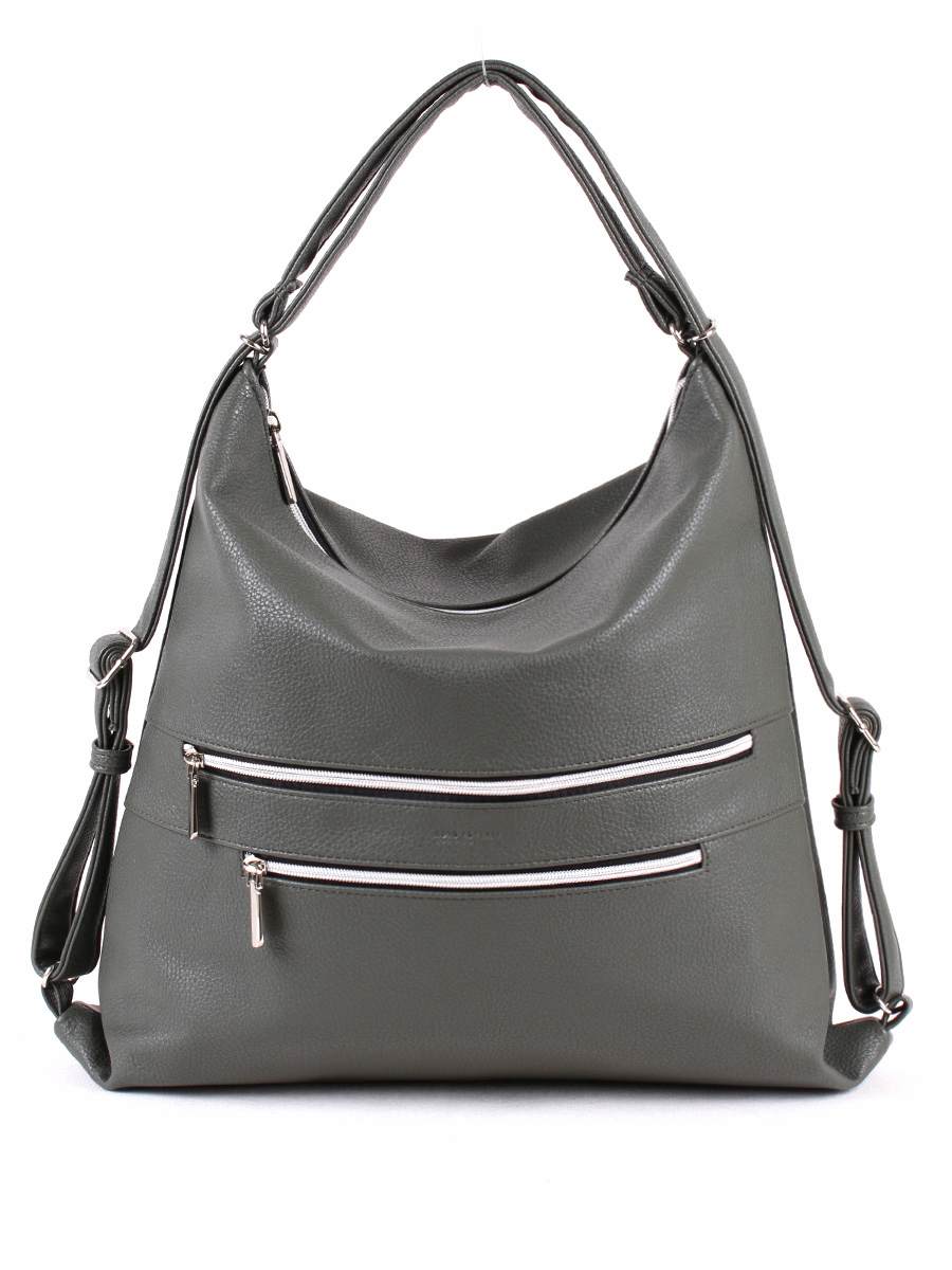 Женская сумка-трансформер с одним отделением на молнии. На передней стенке два, на задней - один карман на молнии. Внутри - два открытых кармана и карман на молнии для документов.   Две регулируемые ручки позволяют трансформировать сумку в рюкзак. Размеры 390х400х110