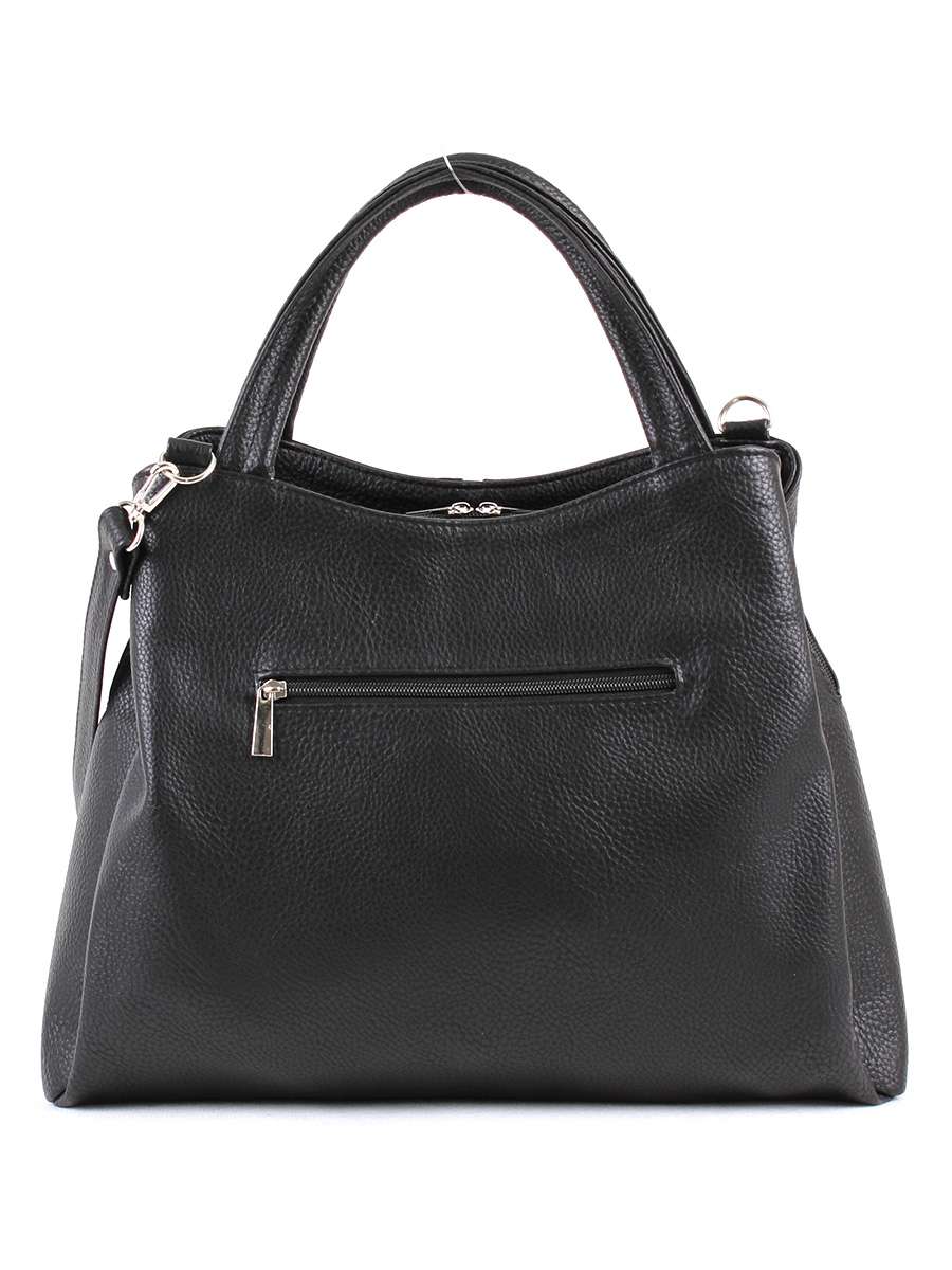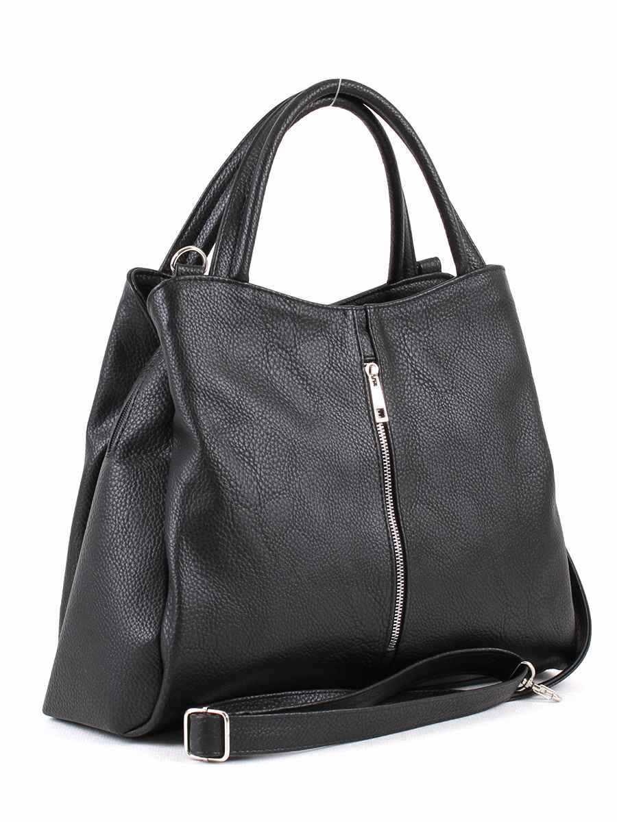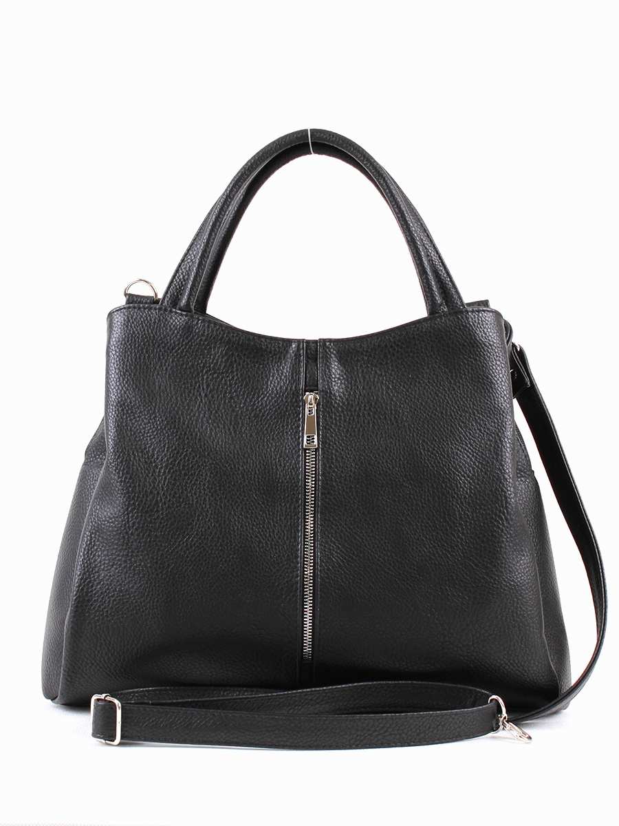 Сумка женская с тремя отделениями на молнии. На передней стенке - вертикальный, на задней - горизонтальный карман на молнии. Внутри среднего отделения - два открытых кармана и карман на молнии. Высота ручек - 16 см. Максимальная длина съемного регулируемого ремня - 125 см.