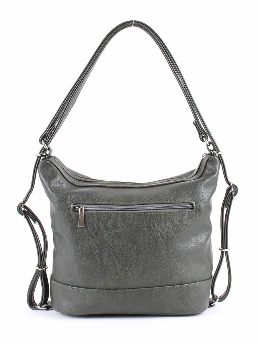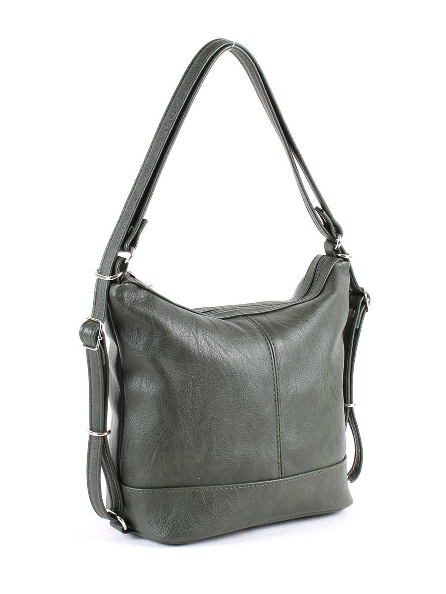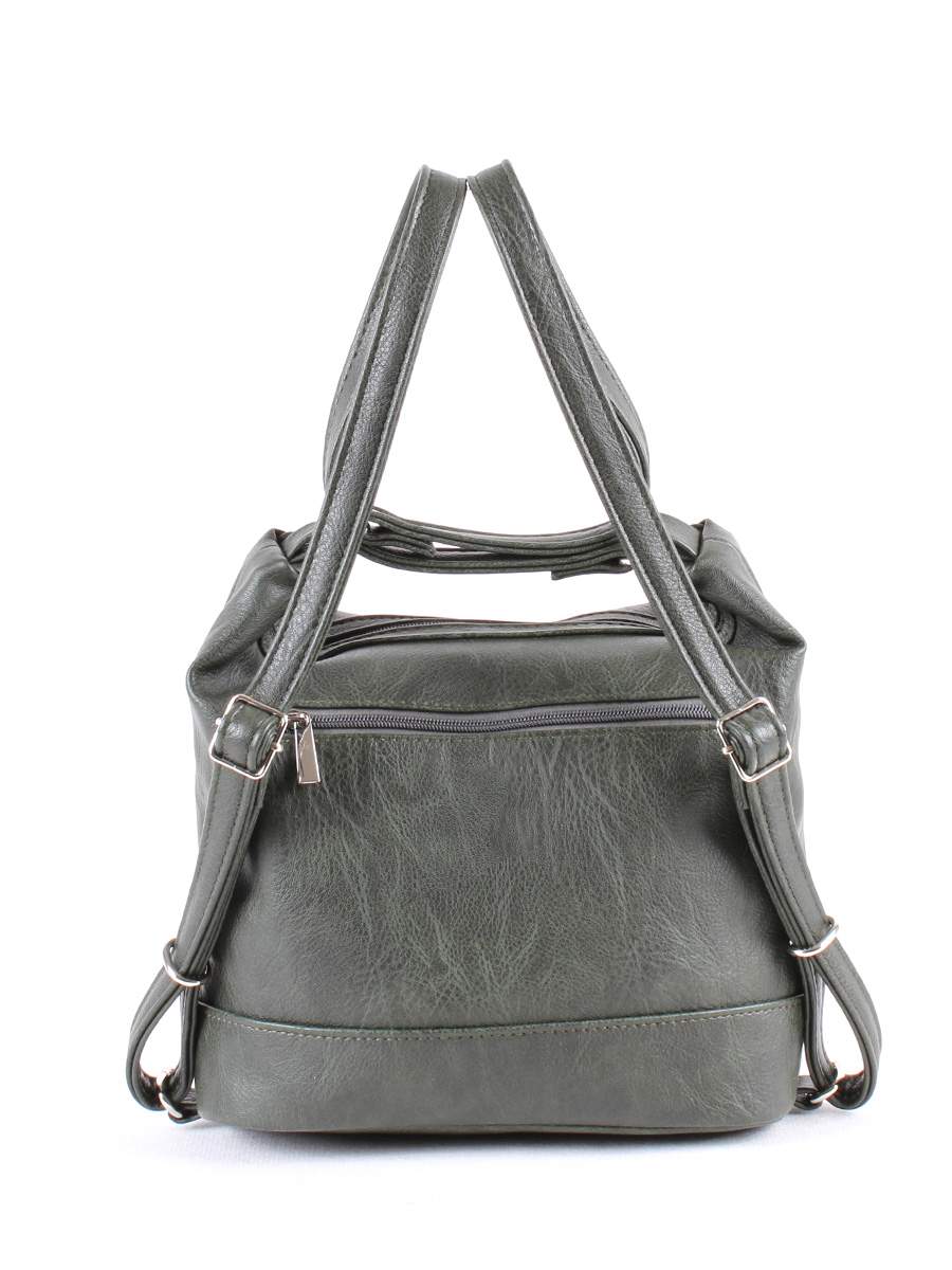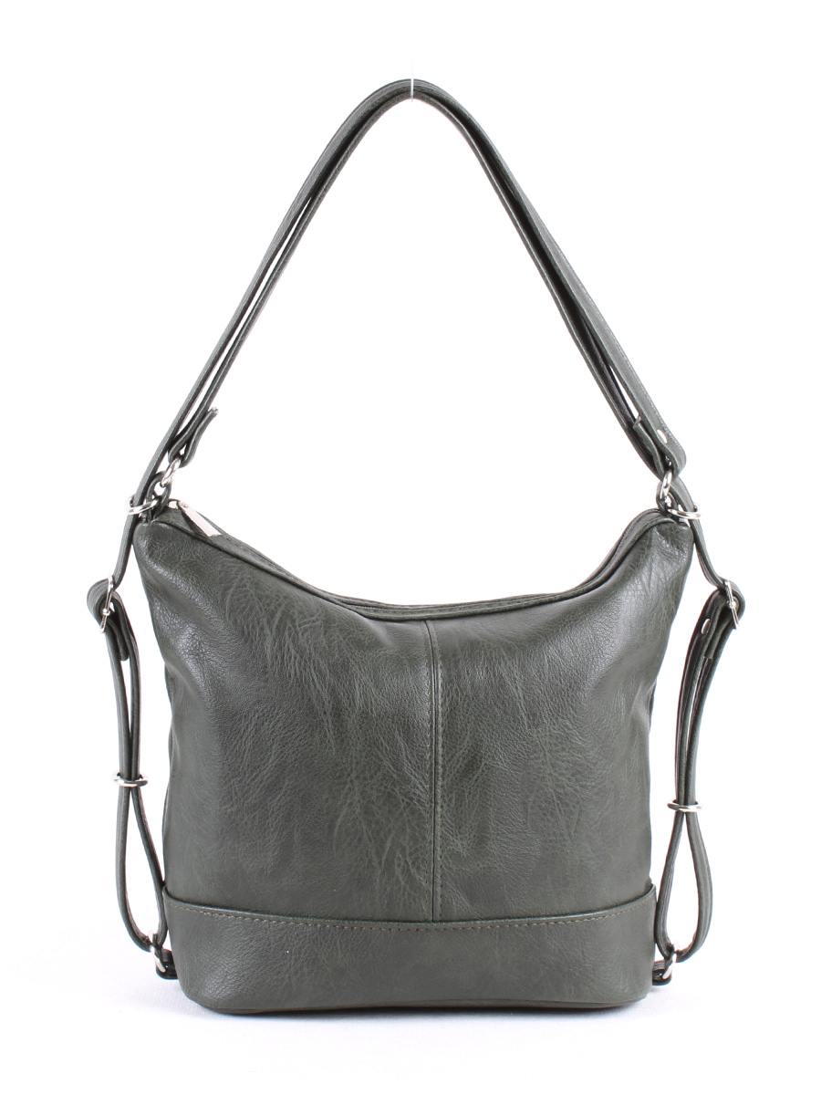 Женская сумка-рюкзак среднего формата. На задней стенке - карман на молнии. Внутри - карман-перегородка на молнии, два открытых кармана и карман на молнии для документов. Максимальная высота несъемных регулируемых ручек при ношении на плече - 33 см.